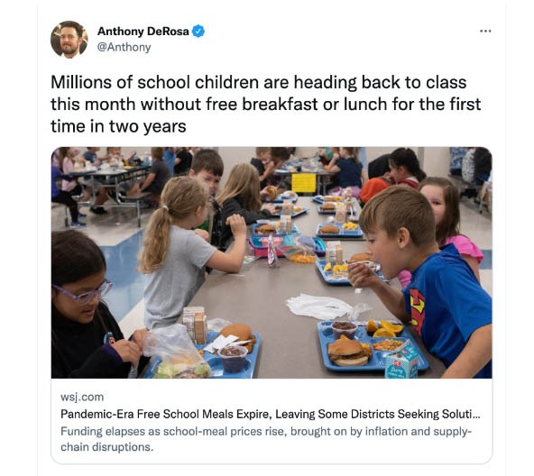 Even though the virus is still kicking, many pandemic-era provisions, including universal free school breakfasts and lunches, are soon to disappear across the nation. As inflation fuels an increase in the cost of school meals, a Wall Street Journal article explored the issue, including how proposed state and federal legislation could “lessen the blow.”