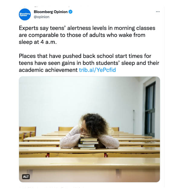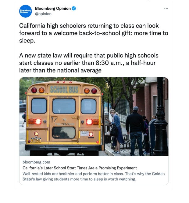 A Paraqeet search showed @opinion — the Twitter feed for Bloomberg Opinion, as the No. 1 influencer under the topics of “back to school” and “health,” covering this issue. On July 1, California enacted a state law making later start times a reality.