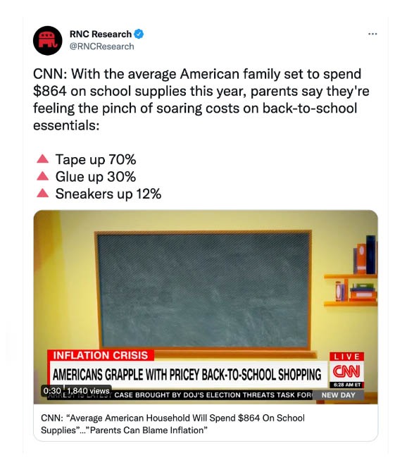 Paraqeet showed that parents and caregivers across Twitter are openly fretting about affording necessary school supplies, especially with the current rate of inflation. @RNCResearch shared a CNN clip highlighting the financial hardships millions of families face this academic year.