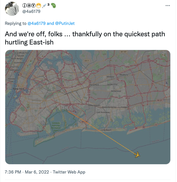 But the fun and games of Sweeney’s hobby took a serious turn when Ukraine came under attack and the Twitterverse wondered if Sweeney could turn his tracking skills on Russia. He obliged. First up, @Putinjets. And, with that, one single person made hundreds of thousands of people sit up and take notice.