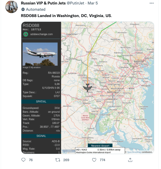 Twitter has taken to the hunt like a pro. One plane landed in Virginia, reportedly to pick up Russian diplomats, and the bot, as it’s designed to do, documented the flight.