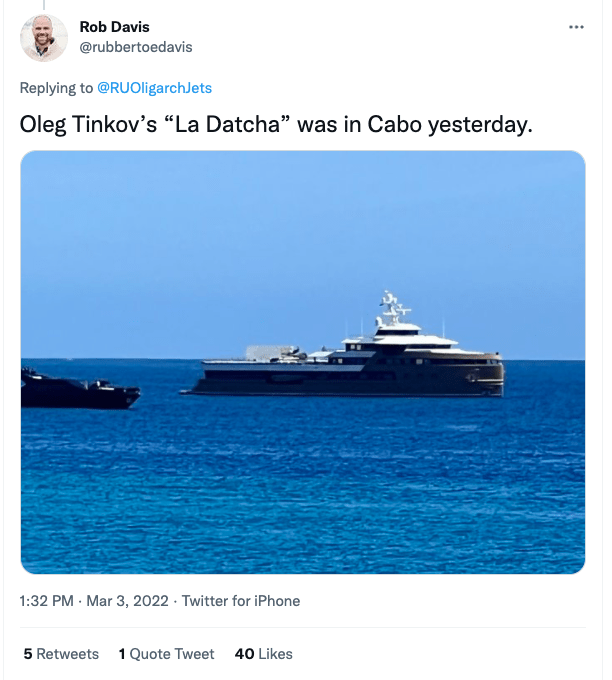 News coverage has reported Russian-owned yachts being moved quickly from their docks and slips to friendlier waters. Not to be outdone by the jetspotters, others around the world offered movement reports and sightings of yachts for possible seizure.
