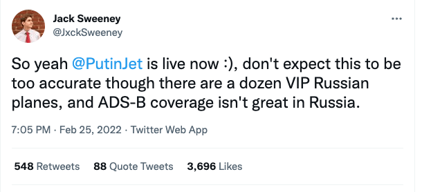 But the fun and games of Sweeney’s hobby took a serious turn when Ukraine came under attack and the Twitterverse wondered if Sweeney could turn his tracking skills on Russia. He obliged. First up, @Putinjets. And, with that, one single person made hundreds of thousands of people sit up and take notice.