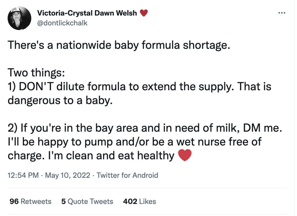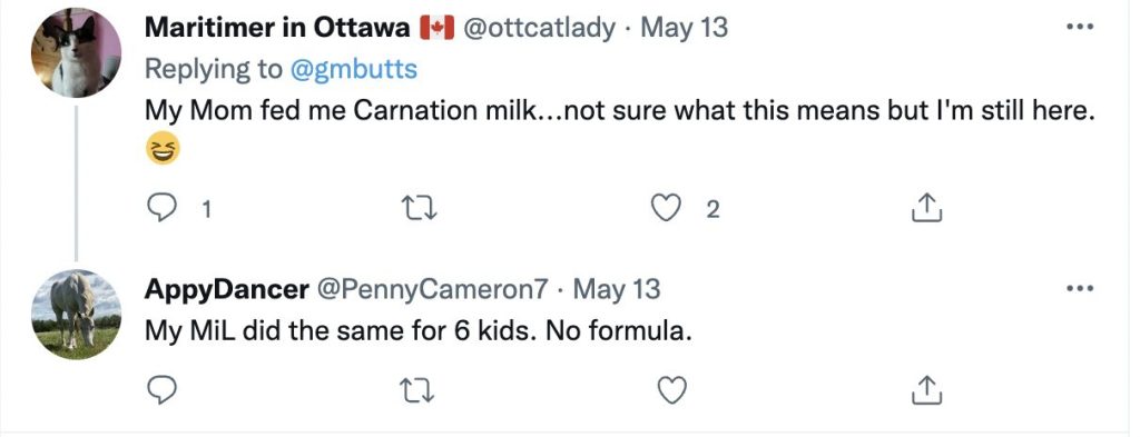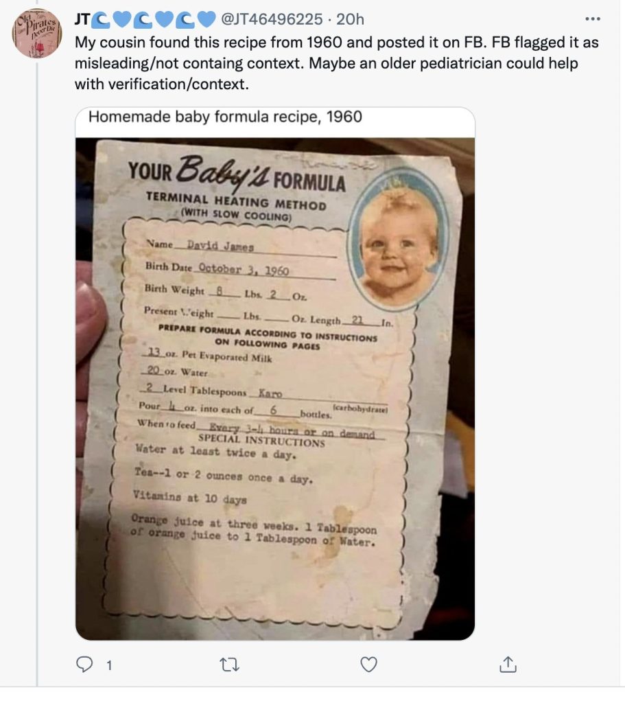 Quite a contingent of Twitter users promoted the “it didn’t kill me” theory in suggesting parents go retro and use homemade formula. To be clear, doctors threw up warning flags, saying homemade formula doesn’t contain the right nutrition and, depending on ingredients, could be deadly.