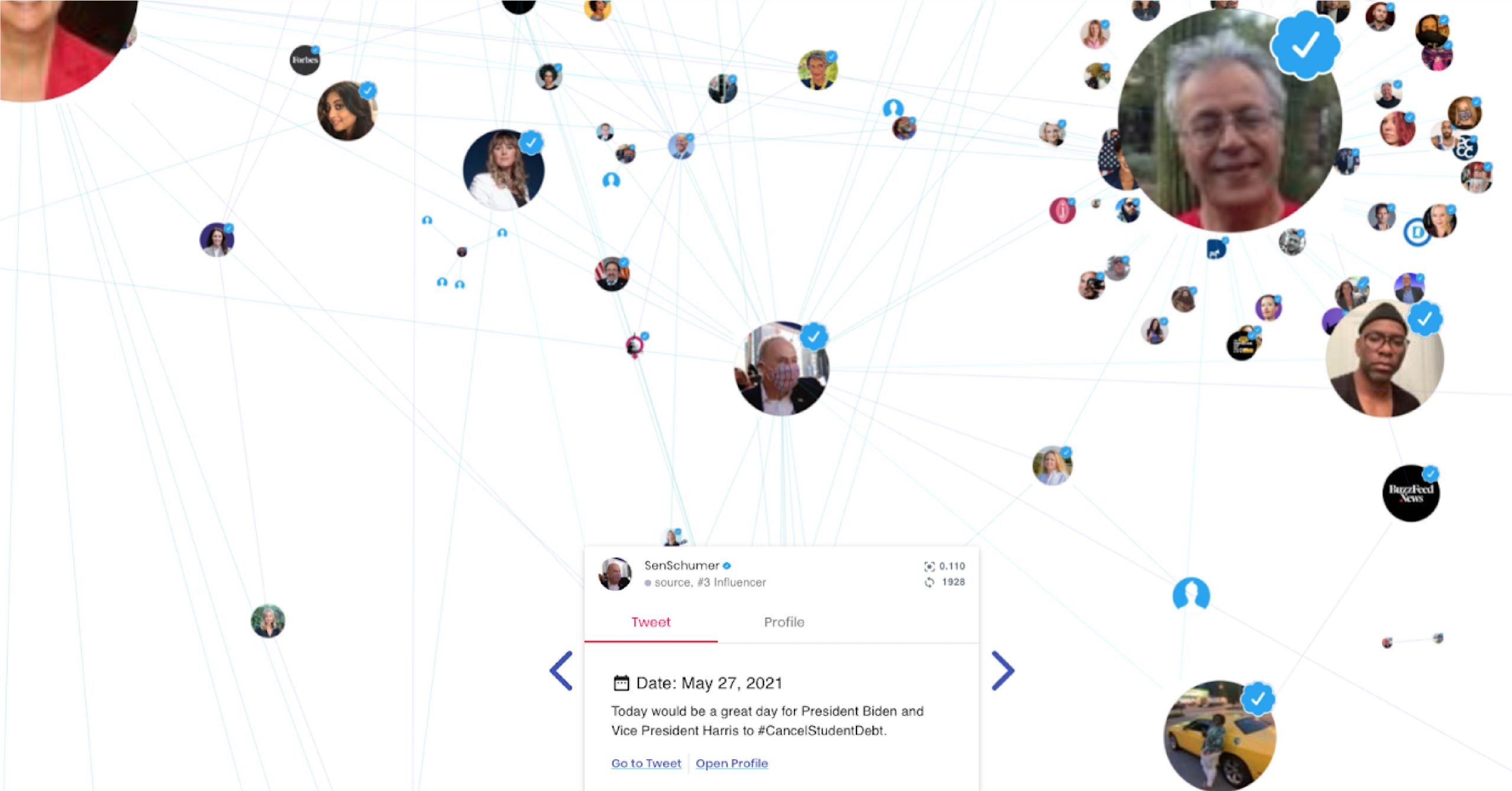 Over several days of searches, Sen. Elizabeth Warren remained the top influencer of verified users, both in her personal account tweets and those made in her official capacity. In asking Biden to cancel student debt, her tweets recalled conversations she’d had with supporters who didn’t think they’d ever be able to repay their entire debt, a story retweeted 2,175 times. Another tweet declared, “You shouldn’t have to get cast in a @shondarhimes TV show to pay off your student loan debt,” as she shared a BuzzFeed story on celebrities speaking out about the issue.